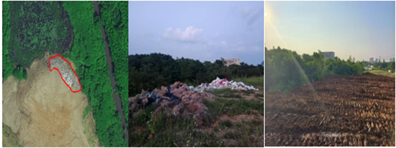 ▲鄂城区长港镇滨港村第十一网格建筑垃圾点卫星遥感图片及整改情况